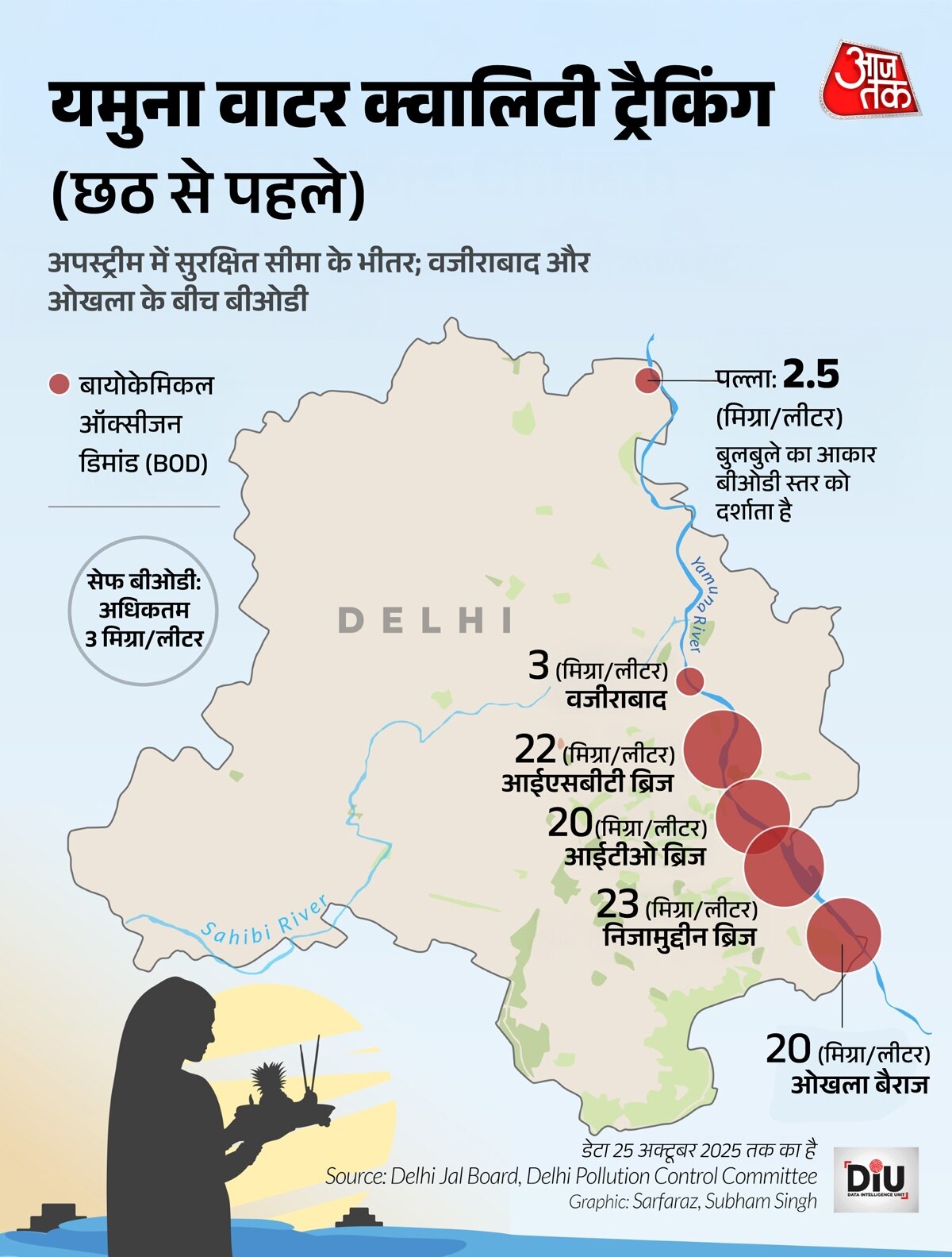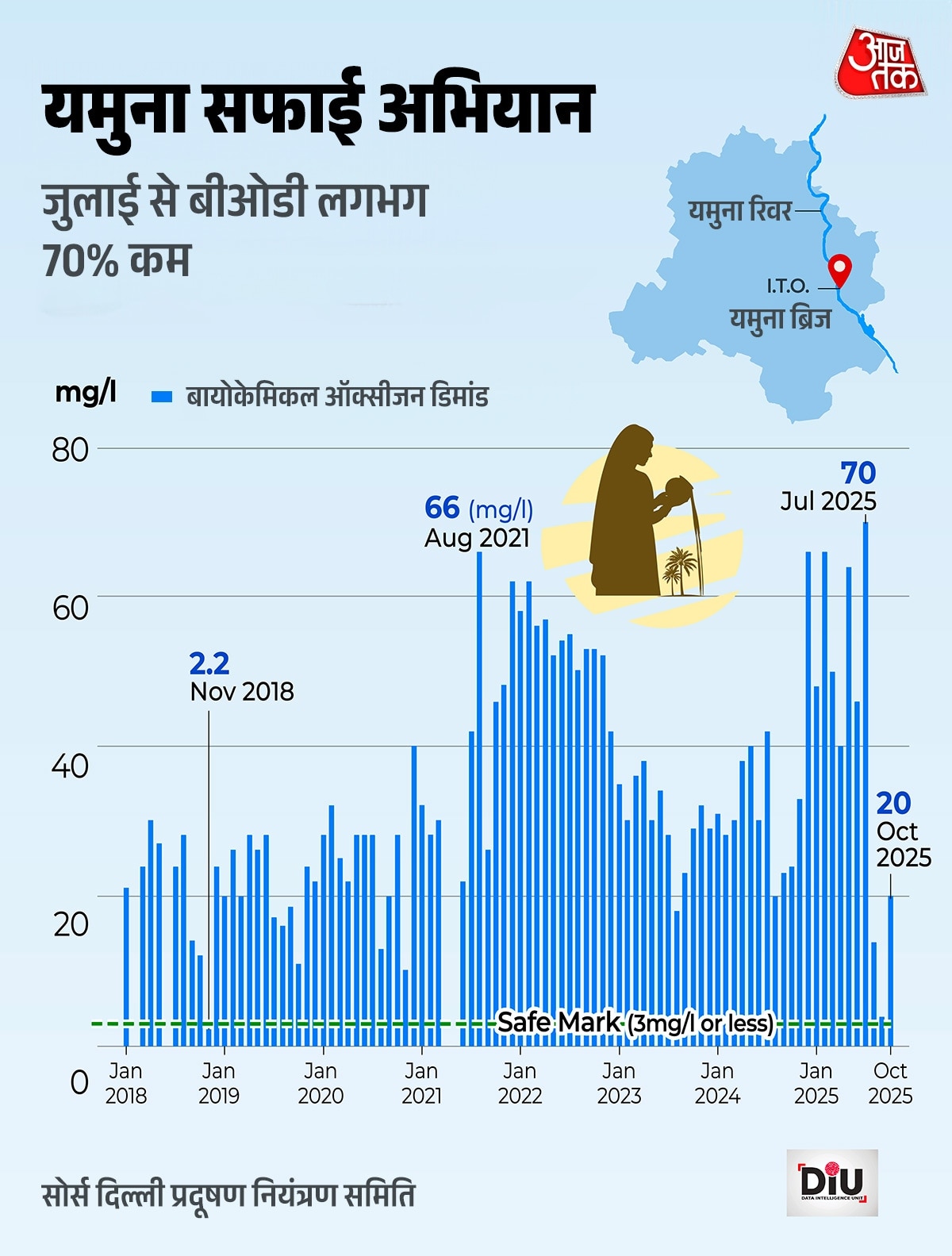 दिल्ली प्रदूषण नियंत्रण समिति (DPCC) के आंकड़ों के मुताबिक पानी में जैविक प्रदूषण की मात्रा बताने वाला बायोकेमिकल ऑक्सीजन डिमांड (BOD) अक्टूबर में ITO ब्रिज के पास 20 mg/L दर्ज किया गया. इसकी सुरक्षित सीमा सिर्फ 3 mg/L है. यानी कई हिस्सों में पानी नहाने या धार्मिक इस्तेमाल के लायक नहीं है.