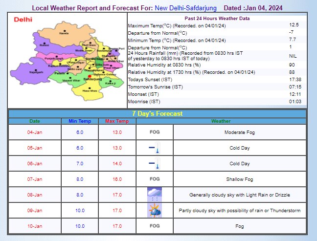 08-09 जनवरी, 2024 के दौरान मध्य प्रदेश, राजस्थान, दक्षिण हरियाणा, दक्षिण उत्तर प्रदेश और दिल्ली में अलग-अलग स्थानों पर बहुत हल्की-हल्की बारिश होने की भी संभावना है. 9 जनवरी तक दिल्ली का न्यूनतम तापमान बढ़कर 10 डिग्री और अधिकतम तापमान 17 डिग्री सेल्सियस तक पहुंच सकता है.