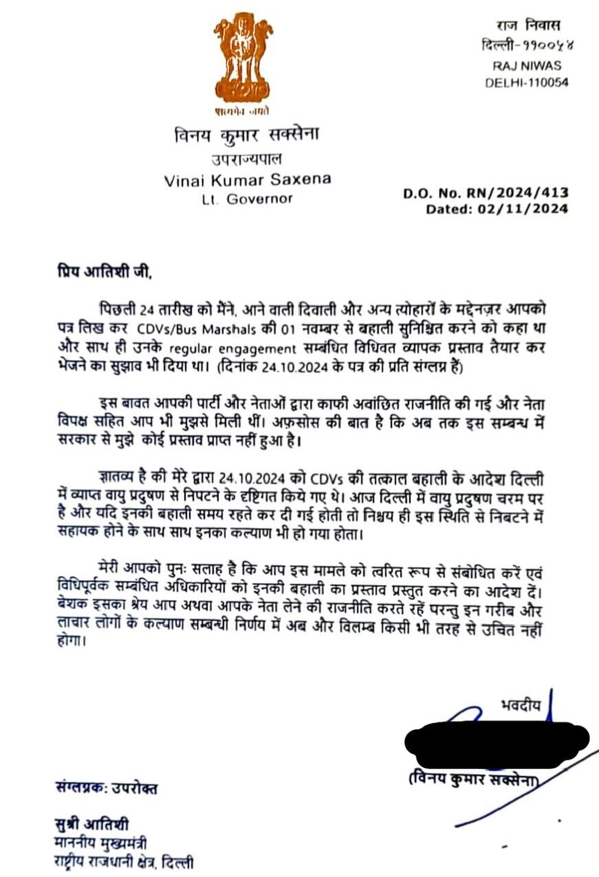उपराज्यपाल सक्सेना ने दिल्ली सरकार को निर्देश दिया था कि आगामी दिवाली त्योहार को देखते हुए 1 नवंबर से नागरिक सुरक्षा स्वयंसेवकों और बस मार्शलों की तुरंत पुनः नियुक्ति की जाए. उन्होंने इस बात पर जोर दिया कि दिल्ली की गंभीर वायु प्रदूषण समस्या से निपटने और प्रभावित लोगों की भलाई हेतु यह नियुक्ति अत्यंत जरूरी है. उन्होंने दिल्ली की मुख्यमंत्री आतिशी को लिखे पत्र में कहा कि उनके पार्टी के नेता इस मुद्दे पर अवांछनीय राजनीति कर रहे हैं. साथ ही, उन्होंने आग्रह किया कि गरीब सीडीवी और प्रदूषण से प्रभावित असहाय लोगों के हित में इस मामले को तुरंत सुलझाया जाए.