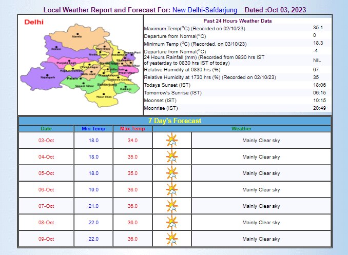 मौसम की बात करें तो दिल्ली में आने वाले दिनों में तापमान में बढ़त देखने को मिलेगी. आज आसमान में हल्के बादल छाए हुए हैं और अधिकतम तापमान 34 और न्यूनतम तापमान 18 डिग्री सेल्सियस दर्ज किया जा सकता है. वहीं आने वाले दिनों की बाद करें तो अगले एक हफ्ते में दिल्ली का अधिकतम तापमान बढ़कर 36 डिग्री हो जाएगा और न्यूनतम तापमान 22 डिग्री सेल्सियस तक पहुंच जाएगा.