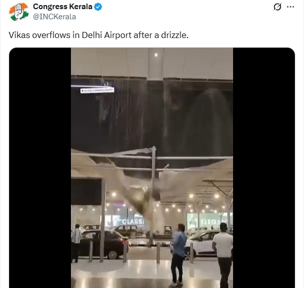वीडियो में दिख रहा है कि बारिश के पानी ने कैनोपी के बीच बने कटोरे जैसे ढांचे में जमा होकर उसे फाड़ दिया. इसके बाद पानी भरभराकर नीचे गिरता दिखा. केरल कांग्रेस ने इस वीडियो को अपने सोशल मीडिया अकाउंट ‘X’ (पूर्व में ट्विटर) पर शेयर करते हुए लिखा, 'बूंदाबांदी के बाद दिल्ली एयरपोर्ट पर विकास बह गया..'
