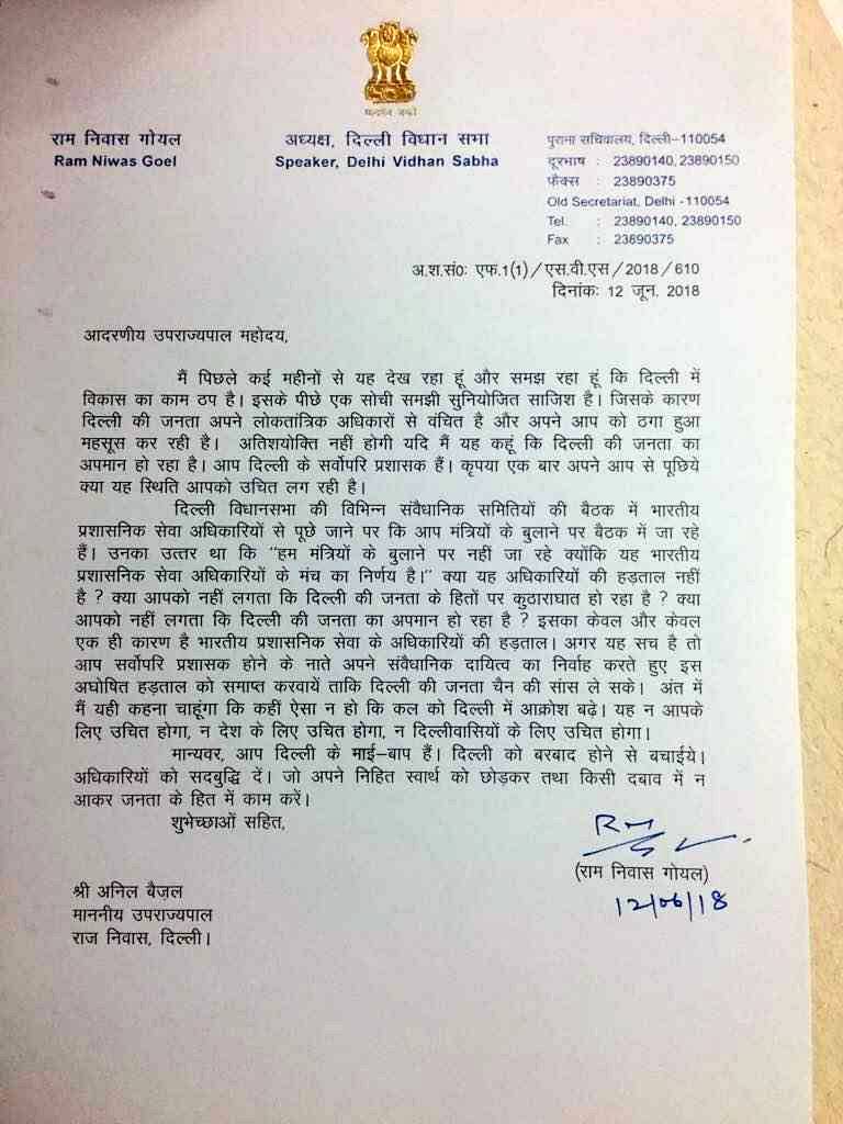 स्पीकर ने अपने खत में एलजी को लिखा है कि एलजी अधिकारियों को सद्बुद्धि दें, जो बिना दबाव के जनता के हित में काम करें. दिल्ली विधानसभा की विभिन्न संवैधानिक समितियों की बैठक में भारतीय प्रशासनिक सेवा अधिकारियों से पूछे जाने पर कि 'आप' मंत्रियों के बुलाने पर बैठक में जा रहे हैं. उनका उत्तर था, 'हम मंत्रियों के बुलाने पर नहीं जा रहे क्योंकि यह भारतीय प्रशासनिक सेवा अधिकारियों के मंच का निर्णय है.'