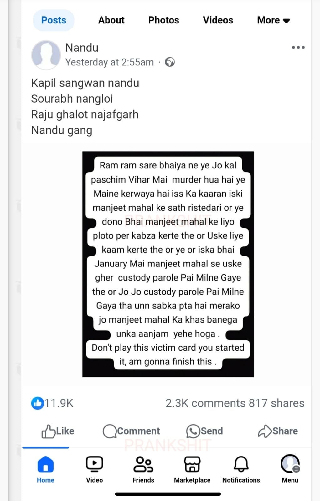 प्रॉपर्टी डीलर राजकुमार दलाल की हत्या की जिम्मेदारी लंदन में बैठे कुख्यात गैंगस्टर कपिल सांगवान उर्फ नंदू ने ली है. सोशल मीडिया पर पोस्ट करके कपिल ने इसकी जिम्मेदारी ली है. कपिल ने पोस्ट किया, 'मैंने हत्या करवाई, वो मेरे दुश्मन मंजीत महाल के लिए प्लॉट पर कब्जा करता था. मंजीत महाल जब पैरोल कस्टडी में आया था तो उस से मिलने भी गया था, जो मंजीत महाल का साथ देगा वो मेरा दुश्मन होगा. जो मंजीत महाल का खास बनेगा उसका यही अंजाम होगा'.