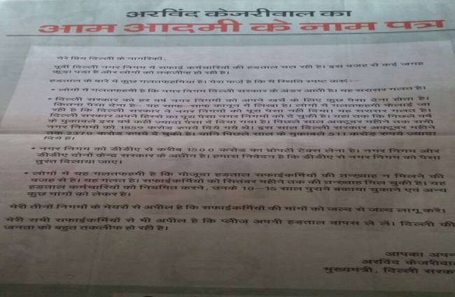 दिल्ली सरकार की ओर से जारी इस विज्ञापन में आम आदमी के नाम पत्र लिखा गया है. जिसमें सफाई कर्मचारियों की हड़ताल को लेकर मचे हंगामे से खुद को दूर करने की कोशिश की गई है. इस चिट्ठी में केजरीवाल ने सफाई कर्मचारियों के वेतन में देरी के लिए उनपर लगाए गए आरोपों को खारिज किया है. उन्होंने इस पत्र में न सिर्फ अपनी स्थिति साफ की है बल्कि तीनों निगमों के मेयरों से अपील की है कि वह सफाई कर्मचारियों की मांगों को जल्द पूरा करें.