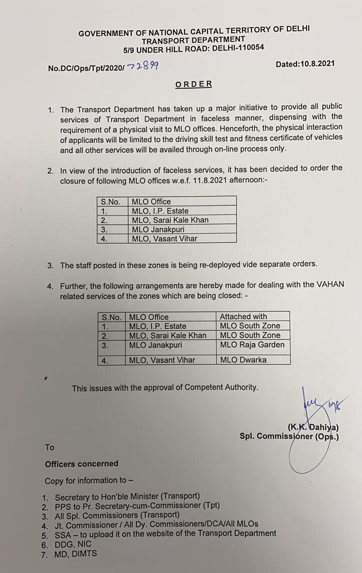 फेसलेस स्कीम के मद्देनजर दिल्ली सरकार के परिवहन विभाग ने दिल्ली के 4 MLO ऑफिस (मोटर लाइसेंसिंग ऑफिसर) को बन्द करने का आदेश जारी किया है. ये चारों दफ्तर 11 अगस्त की दोपहर से बन्द कर दिए जाएंगे. ये दफ्तर हैं-