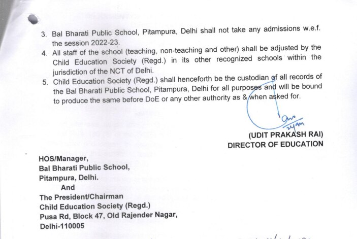 नए आदेश के बाद अगले शैक्षणिक सत्र 2022-23 के लिए बाल भारती पब्लिक स्कूल, पीतमपुरा में कोई एडमिशन नहीं ले सकेगा. वहीं मान्यता रद्द किए जाने के बाद स्कूल के टीचिंग और नॉन टीचिंग स्टाफ, चाइल्ड एजुकेशन सोसाइटी द्वारा दूसरे मान्यता प्राप्त स्कूलों में संस्थाओं में एडजस्ट किए जाएंगे.