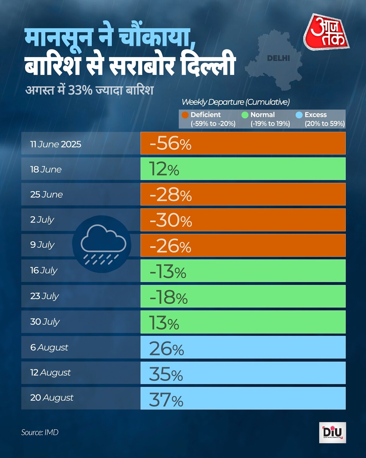 जुलाई की शुरुआत में बारिश हल्के रुख के साथ आई लेकिन जुलाई के आखिर में अचानक पलटवार हुआ. 30 जुलाई को खत्म हुए हफ्ते में बारिश 13% सरप्लस रही. अगस्त के पहले हफ्ते में ये सरप्लस 26% तक पहुंच गया. 12 अगस्त तक बारिश 35% ज्यादा हो गई. फिर 20 अगस्त तक ये बढ़कर 37% सरप्लस हो गया. यानी अगस्त की लगातार दो हफ्तों की जोरदार बारिश ने जून-जुलाई की सारी कमी को पलट दिया और दिल्ली को एक दशक से ज्यादा वक्त के सबसे बारिश भरे मॉनसून में बदल दिया.