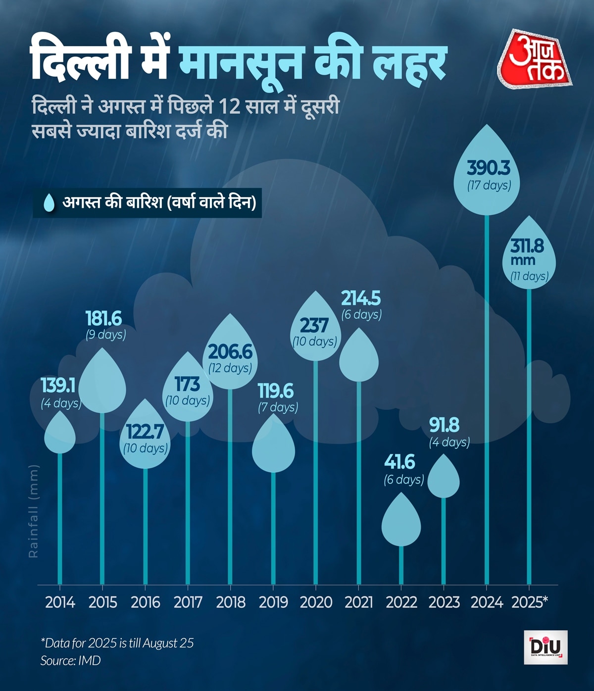 दिल्ली का मॉनसून इस साल बिल्कुल बदला-बदला नज़र आया. जून-जुलाई तक बारिश की कमी थी, लेकिन अगस्त में इतनी बारिश हुई कि ये महीना रिकॉर्ड बुक में दर्ज हो गया. अगस्त 2025 अब तक पिछले दस साल से ज्यादा समय में दूसरा सबसे बारिश भरा अगस्त बन चुका है.