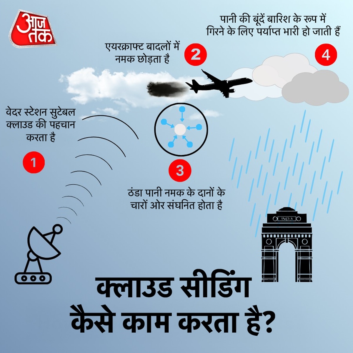 क्लाउड सीडिंग एक 75 साल पुरानी तकनीक है, जिसमें विशेष ‘बीज’ कणों (generally सिल्वर आयोडाइड) का उपयोग करके उपयुक्त बादलों को संशोधित किया जाता है ताकि बारिश कराई जा सके. ये बीज कण पानी की भाप (water vapour) को आकर्षित करते हैं. इसके चारों ओर पानी संघनित होता है और भारी होकर बारिश के रूप में गिरता है.