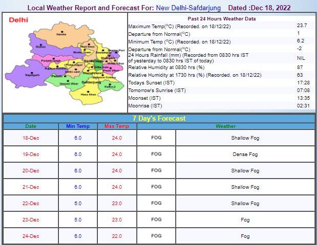 IMD के मुताबिक, दिल्ली में 24 दिसंबर तक मध्यम से घना तक कोहरे की धुंध देखने को मिलेगी. इस दौरान राष्ट्रीय राजधानी में न्यूनतम तापमान 6 डिग्री सेल्सियस और अधिकतम तापमान 24 डिग्री सेल्सियस तक बने रहने की संभावना है. भारत मौसम विज्ञान विभाग (IMD) के अनुसार, 22 एवं 23 दिसंबर को न्यूनतम तापमान 5 डिग्री तक पहुंच सकता है. मौसम पूर्वानुमान एजेंसी स्काईमेट के अनुसार, उत्तर-पश्चिमी शुष्क और ठंडी हवाएं देश के उत्तर-पश्चिम, मध्य और पूर्वी हिस्सों में जारी रहेंगी. जिससे दिन और रात के तापमान में और गिरावट आएगी.