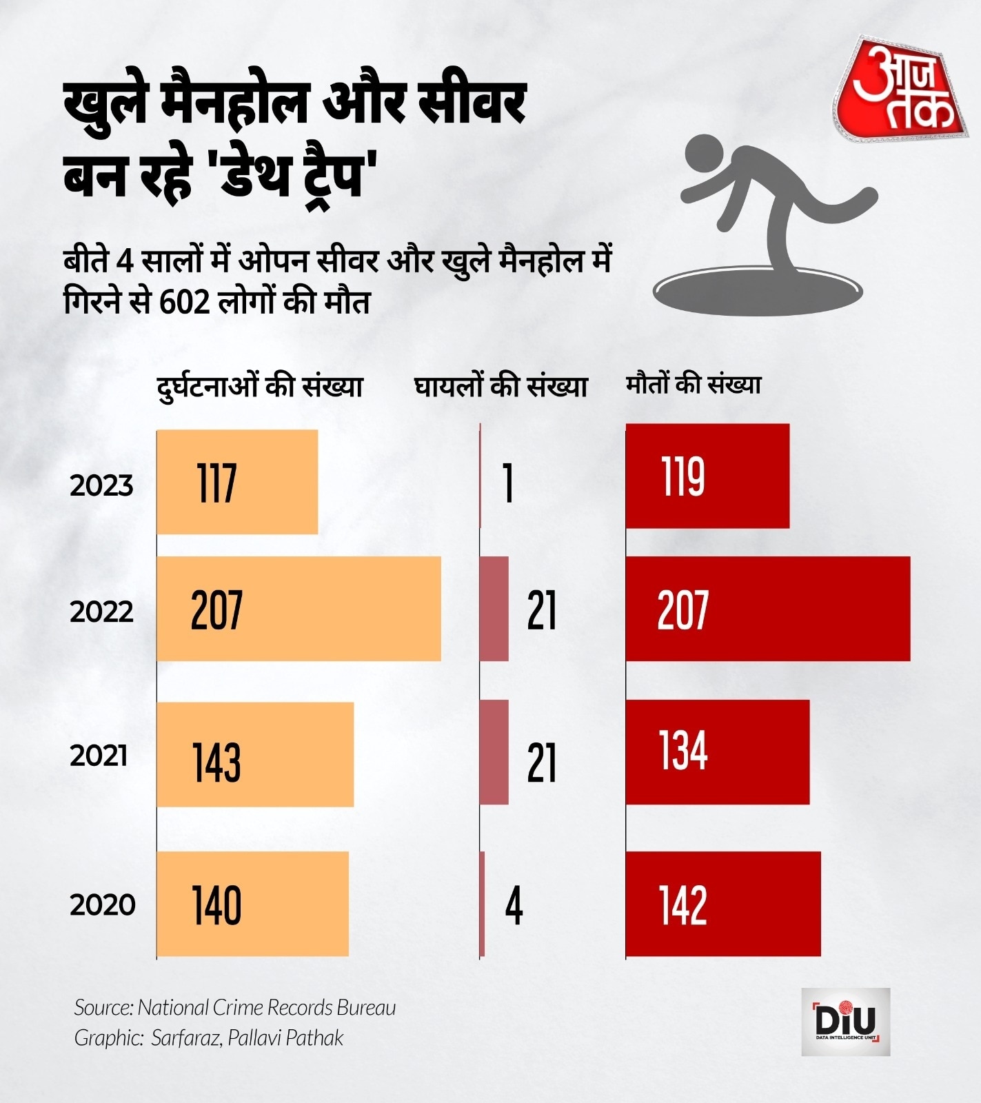 कम दृश्यता के साथ-साथ खुले मैनहोल और सीवर भी लोगों की जान के लिए बड़ा खतरा बने हुए हैं. राष्ट्रीय अपराध रिकॉर्ड ब्यूरो के अनुसार, 2020 में खुले मैनहोल और सीवर में गिरने से 140 हादसे हुए और 142 लोगों की मौत हुई. 2021 में 143 हादसों में 134 लोगों की जान गई. 2022 सबसे खतरनाक साल रहा, जब 207 हादसों में 207 मौतें दर्ज की गईं. 2023 में हादसों की संख्या कम हुई, लेकिन मौतें अब भी ज्यादा रहीं.