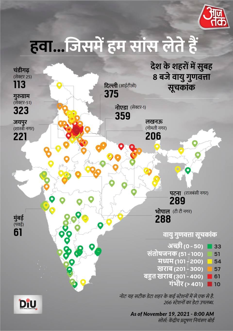 गाजियाबाद, ग्रेटर नोएडा और गुरुग्राम मे भी हवा 'बहुत खराब' श्रेणी में बनी हुई है. ये स्थिति तब है जब स्कूलों को बंद कर दिया गया है और दिल्ली में ट्रकों की एंट्री पर भी रोक लगी हुई है. पिछले दिनों की तुलना में प्रदूषण स्तर थोड़ा घटा जरूर है, लेकिन AQI का 400 पार जाना सेहत के लिहाज से काफी खतरनाक है.