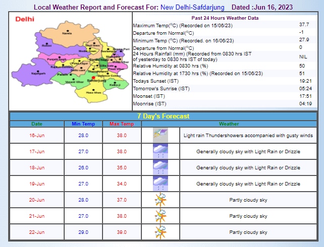 आईएमडी के मुताबिक, दिल्ली के कई स्थानों (विवेक विहार, लाल किला, प्रीत विहार, राजीव चौक, आईटीओ, इंडिया गेट, अक्षरधाम, पालम, सफदरजंग, लोदी रोड, नेहरू स्टेडियम, आईजीआई हवाई अड्डा) में हल्की से मध्यम तीव्रता की बारिश और 30-40 किमी/घंटा की तेज़ हवाएं चलेंगी.