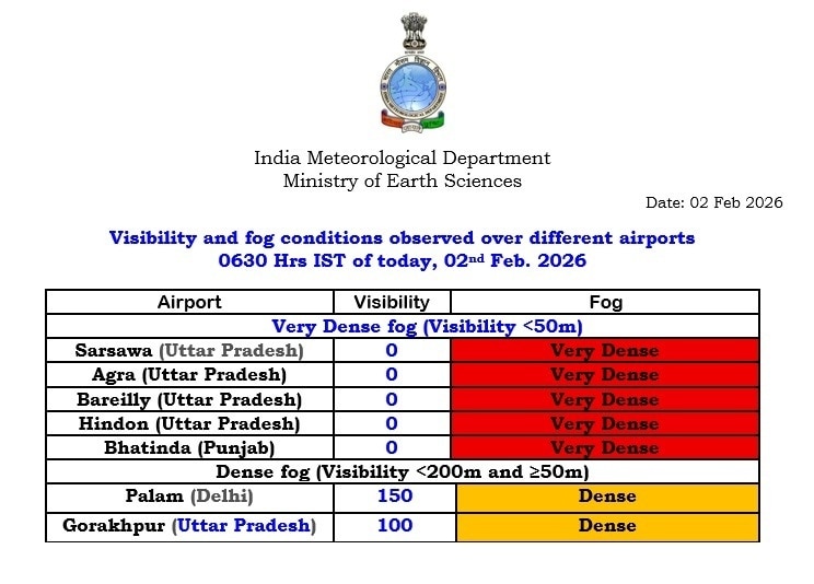 देश के कई एयरपोर्ट्स पर भी आज विजिबिलिटी जीरो दर्ज की गई. इनमें सरसवा (उत्तर प्रदेश), आगरा (उत्तर प्रदेश), बरेली (उत्तर प्रदेश), हिंडन (उत्तर प्रदेश) से लेकर भटिंडा (पंजाब) तक शामिल हैं.