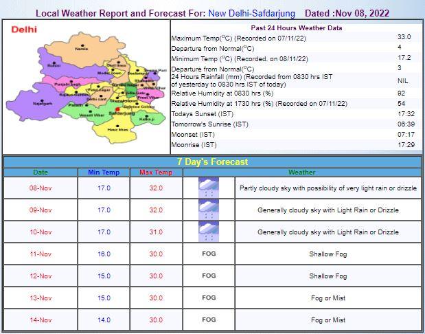 IMD के मुताबिक, शनिवार को राजधानी का अधिकतम तापमान 30.6 डिग्री था. वहीं, न्यूनतम तापमान 17 डिग्री सेल्सियस दर्ज किया गया जो इस मौसम के सामान्य से तीन डिग्री अधिक है. IMD के पूर्वानुमान के मुताबिक, दिल्ली में 8 नवंबर से 10 नवंबर तक हल्की बूंदाबांदी हो सकती है. ऐसे में तापमान में मामूली कमी आने की संभावना है. मौसम विभाग के मुताबिक, दिल्ली में वीकेंड पर न्यूनतम तापमान 15 डिग्री सेल्सियस और अधिकतम तापमान 30 डिग्री सेल्सियस तक रह सकता है.