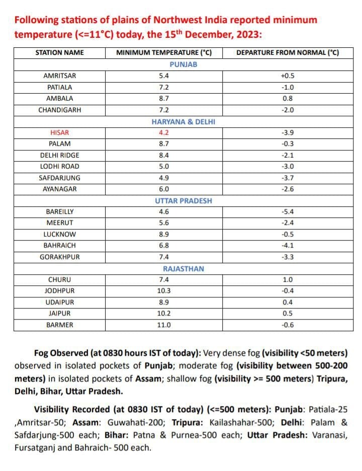 इसके अलावा बरेली में तापमान 4.6 दर्ज किया गया. फिर सफदरजंग में तापमान 4.9 डिग्री सेल्सियस मापा गया. बता दें कि पहाड़ों पर बर्फबारी के बाद से मैदानी इलाकों में ठंड बढ़ने लगी है और तापमान में गिरावट दर्ज की जा रही है. पंजाब के अलग-अलग हिस्सों में बहुत घना कोहरा देखा गया और उत्तर प्रदेश, बिहार, असम, मेघालय और त्रिपुरा के अलग-अलग हिस्सों में हल्का से मध्यम कोहरा देखा गया.