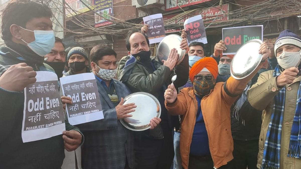 दिल्ली के कुतुब रोड चौक पर व्यापारियों ने बुधवार को थाली बजाकर दिल्ली सरकार के फैसले के खिलाफ प्रदर्शन किया. विरोध करने आए व्यापारी हाथ पर काली पाटी बांधे थे. उनके हाथ में प्ले कार्ड था, जिसमें लिखा था नहीं चाहिए ऑड ईवन (ऑड ईवन नहीं चाहिए).