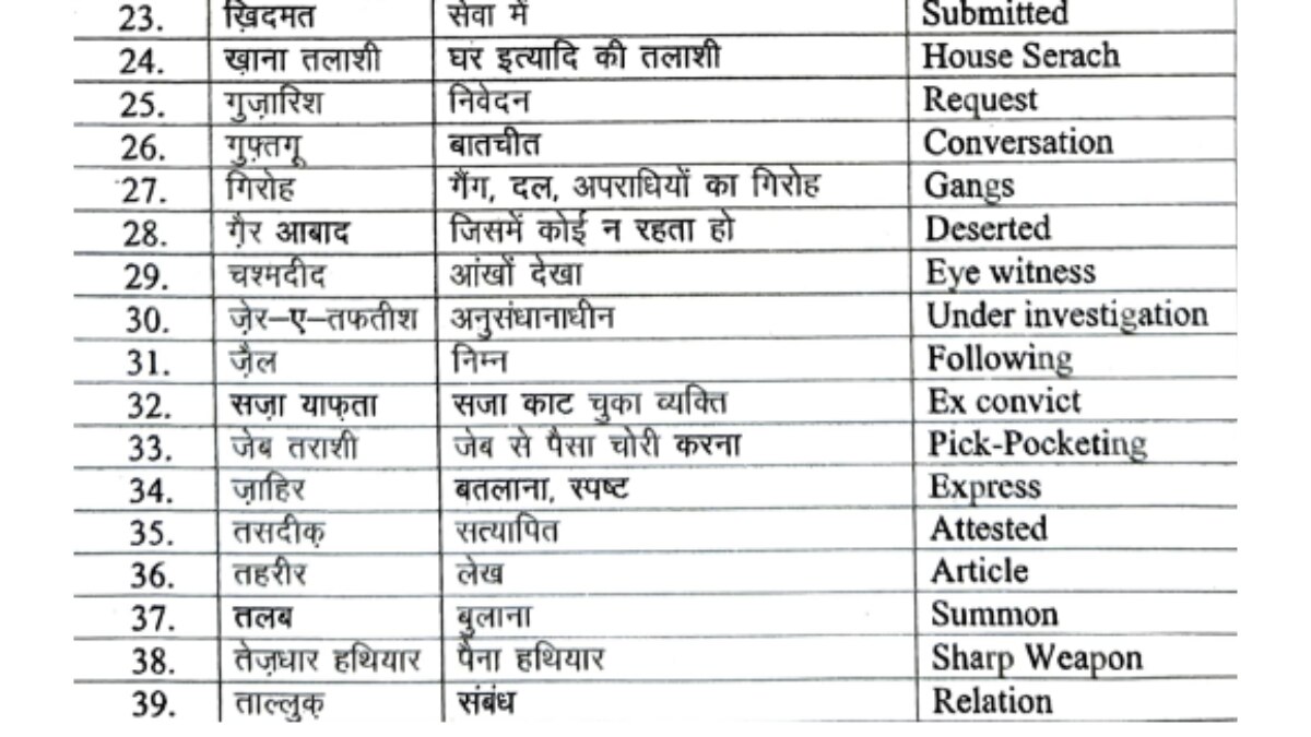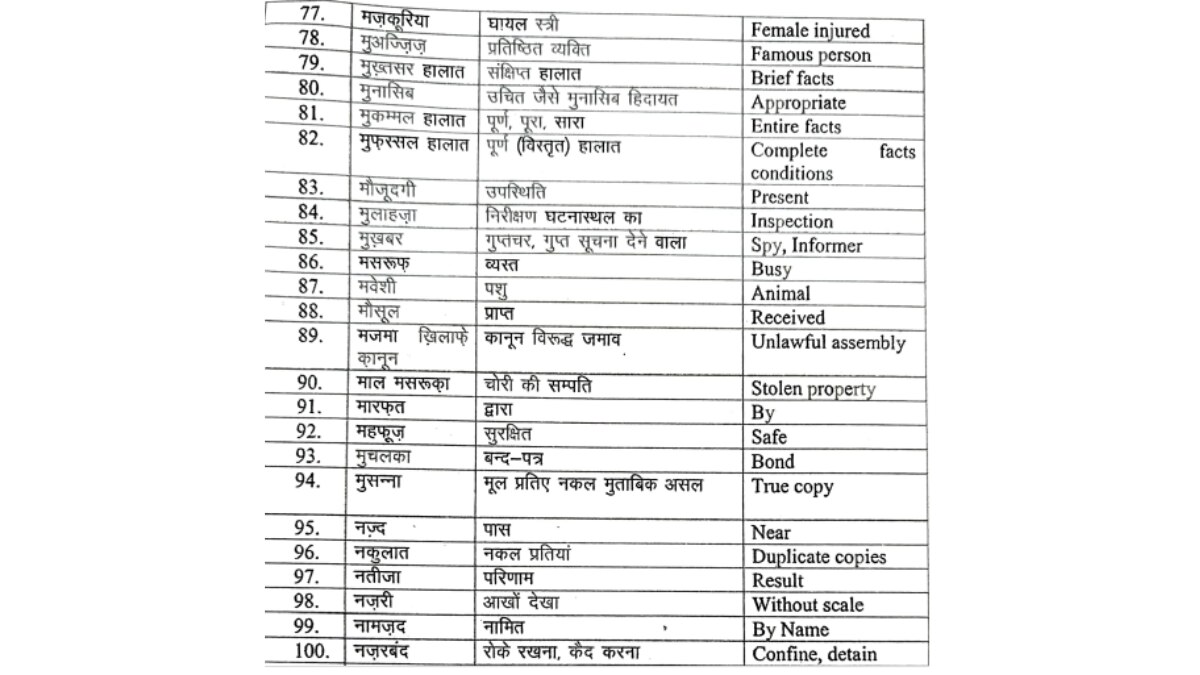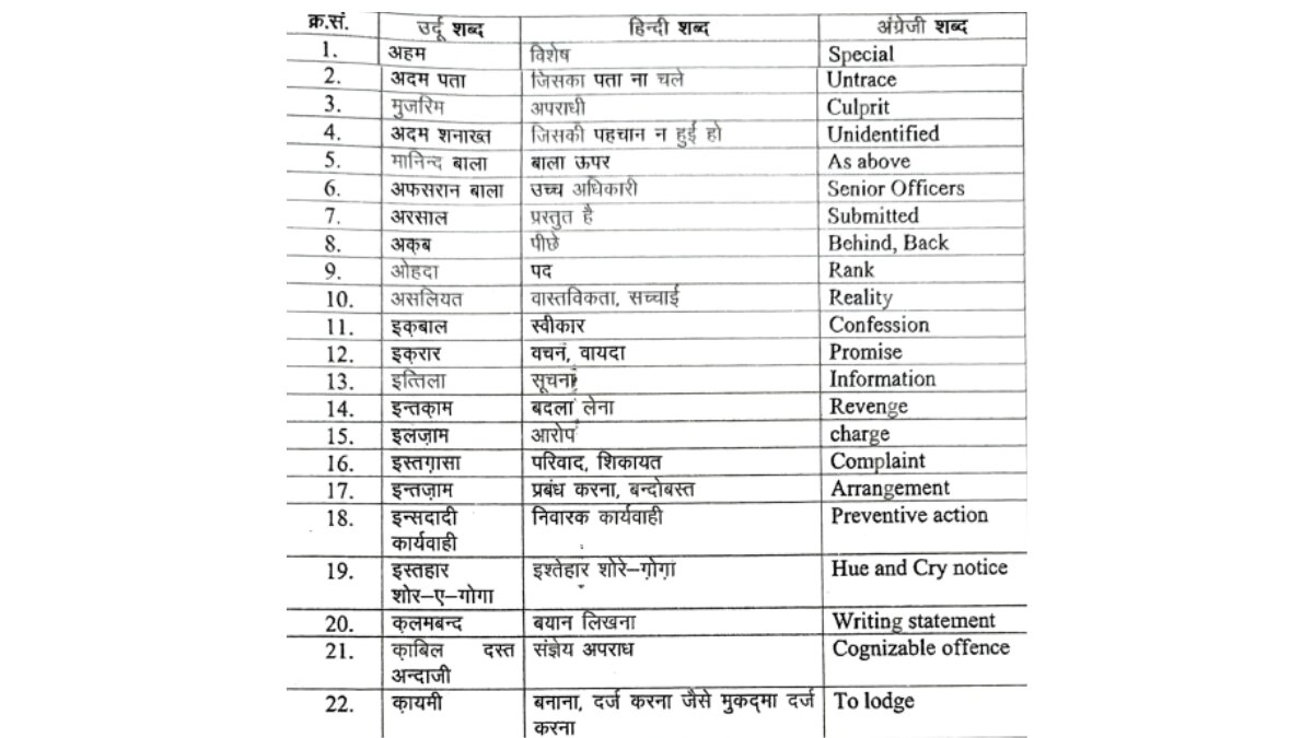 पुलिस की तरफ से ऐसे उर्दू और फारसी शब्दों की एक लिस्ट भी जारी की गई है, जिनका इस्तेमाल अबतक एफआईआर में किया जा रहा था. इन कठिन शब्दों के साथ उनकी जगह सरल शब्दों की भी लिस्ट दी गई है, ताकि अधिकारी एफआईआर और चार्जशीट के वक्त उन शब्दों का इस्तेमाल करें, ताकि शिकायतकर्ता और उस मामले से जुड़े लोग आसानी से उसका मतलब समझ सकें.