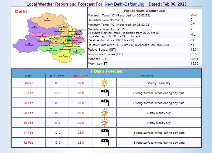 IMD Weather Forecast: फरवरी महीने के पहले हफ्ते में दिल्ली के बढ़ते तापमान ने पिछले 12 साल का रिकॉर्ड तोड़ दिया है. मौसम विभाग के मुताबिक, 2011 के बाद यह पहली बार है, जब राष्ट्रीय राजधानी में फरवरी के पहले सप्ताह में अधिकतम तापमान 29 डिग्री सेल्सियस या उससे अधिक दर्ज किया गया. दिल्ली में सोमवार (7 फरवरी) को अधिकतम तापमान 29 डिग्री सेल्सियस रिकॉर्ड हुआ, जो सामान्य से छह डिग्री अधिक है और दो साल में इस महीने का सबसे अधिक तापमान है. वहीं, न्यूनतम तापमान 9.2 डिग्री सेल्सियस दर्ज किया गया, जो इस सीजन के लिए सामान्य है.