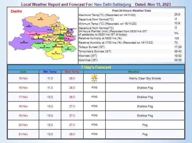 मौसम का पूर्वानुमान लगाने वाली एजेंसी, स्काईमेट के मुताबिक, दिल्ली में शुष्क मौसम बना हुआ है, कम से कम अगले दस दिनों तक मौसम शुष्क ही बना रहेगा क्योंकि मैदानी इलाकों में कोई महत्वपूर्ण सिस्टम देखने की उम्मीद नहीं है. एक कमजोर पश्चिमी विक्षोभ 18 नवंबर को उत्तर भारत की पहाड़ियों पर पहुंचने के लिए तैयार है, यह सिस्टम पहाड़ियों और मैदानी इलाकों के मध्य और ऊंचे इलाकों तक सीमित रहेगा लेकिन पहाड़ों पर बारिश या बर्फबारी से ठंडी हवाएं मैदानी इलाकों का रुख करेंगी. इसके बाद ठंड बढ़ेगी. यानी नवंबर के आखिरी हफ्ते में दिल्ली में ठंड बढ़ने की संभावना है.