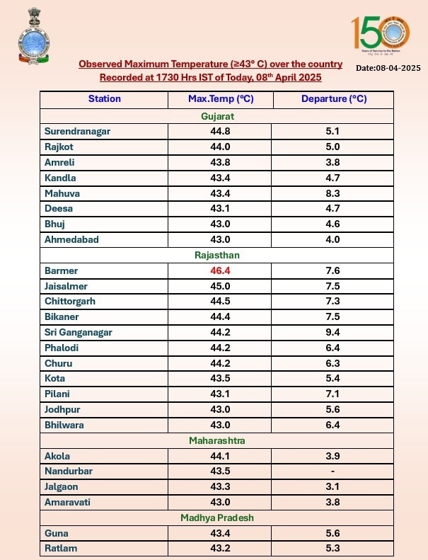 राजस्थान और गुजरात में भी प्रचंड गर्मी पड़ रही है. राजस्थान के बाड़मेर में आज तापमान 46.4 डिग्री और जैसलमेर में 45 डिग्री रहा. गुजरात के सुरेंद्रनगर में तापमान 44.8 डिग्री और राजकोट में 44 डिग्री रहा.