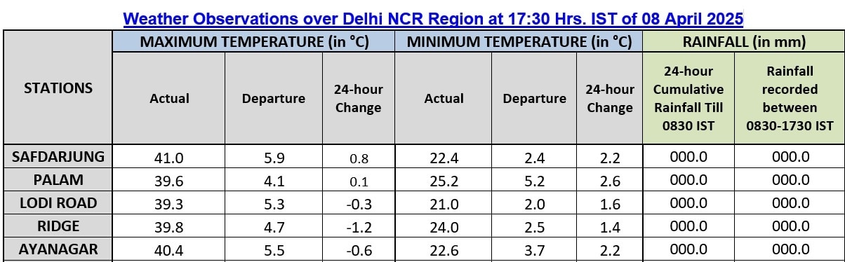 भारतीय मौसम विज्ञान विभाग (आईएमडी) के अनुसार, सफदरजंग मौसम स्टेशन ने मंगलवार को अधिकतम तापमान 41.0 डिग्री सेल्सियस दर्ज किया. अयनागर और पालम में भी तापमान क्रमशः 40.4 डिग्री और 39.6 डिग्री सेल्सियस दर्ज किया गया है.