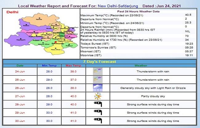 दिल्ली मौसम विभाग के मुताबिक, 25 जून को भी दिल्ली में तेज हवाएं और बारिश की संभावना है. इस दौरान न्यूनतम तापमान 29 डिग्री और अधिकतम तापमान 37.0 डिग्री रहने का अनुमान है. वहीं, 26 तारीख को भी बादल छाए रहेंगे और हल्की बारिश हो सकती है. 27 जून को भी मौसम ऐसा ही बना रह सकता है. वहीं, 28, 29 और 30 जून को राज्य में दिन के समय तेज हवाएं चल सकती हैं.