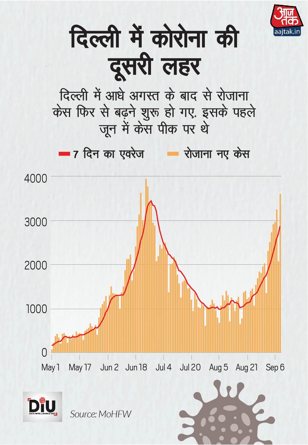 दिल्ली में जून के अंत में कोरोना का पहला पीक (शिखर) था जब हर दिन औसतन 3,000 तक केस आ रहे थे. डेली केस की संख्या जुलाई से कम होनी शुरू हुई और जुलाई के अंत तक जारी रही, जब दिल्ली में प्रति दिन 1,000 से ज्यादा केस आ रहे थे. हालांकि, आधे अगस्त के बाद से दिल्ली में रोजाना केस फिर से लगातार बढ़ रहे हैं.