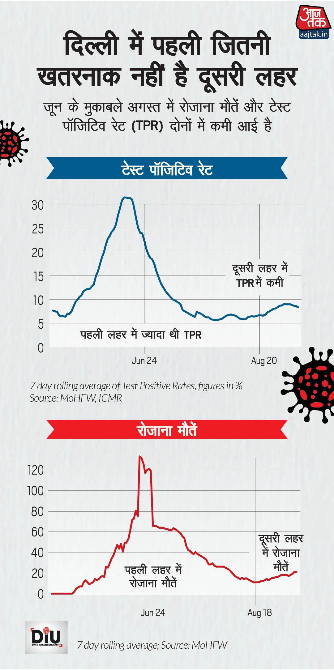 दिल्ली में ना सिर्फ पॉजिटिविटी रेट में कमी आई है, बल्कि दूसरी लहर के दौरान रोजाना मौतें भी पहली लहर की तुलना में काफी कम हैं. जून में जब दिल्ली में कोरोना पीक पर था और हर दिन 3,000 केस दर्ज हो रहे थे, उस समय हर दिन 60-80 मौतें हो रही थीं. पिछले दो हफ्तों से दिल्ली में हर दिन 19-20 मौतें हो रही हैं. हालांकि, अब पॉजिटिव केसों की संख्या बढ़ने लगी है.