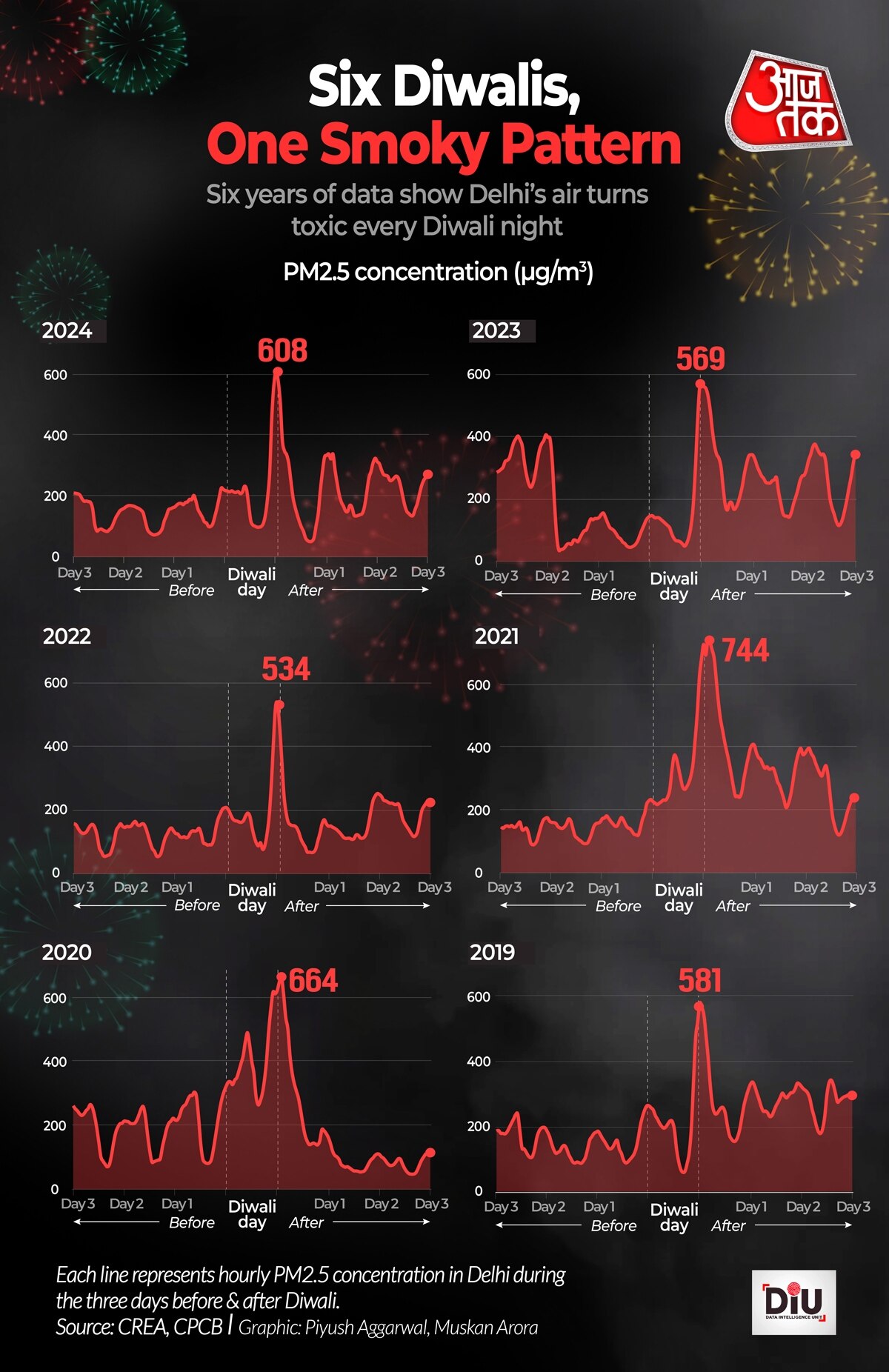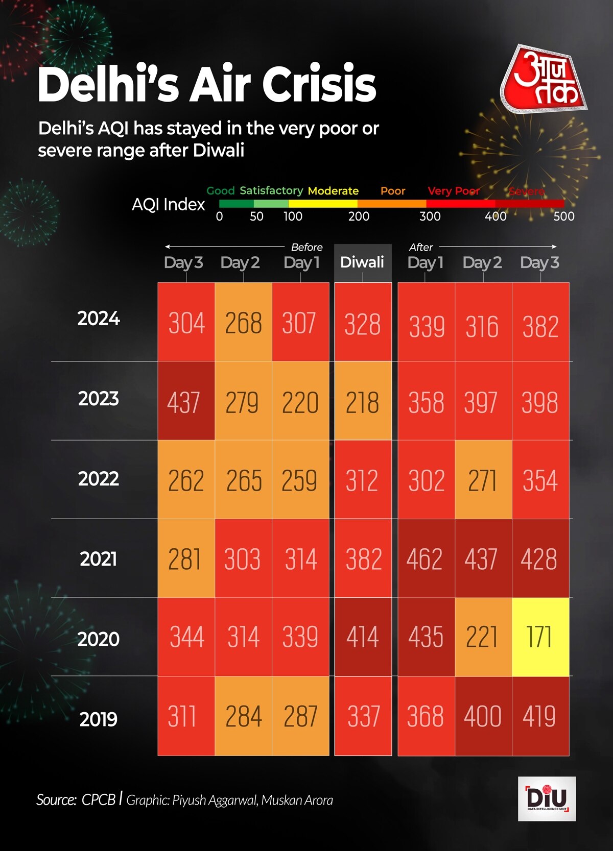 2019 में दीवाली के हफ्ते में दिल्ली का औसत एयर क्वालिटी इंडेक्स (AQI) 343 था जो 'बहुत खराब' कैटेगरी में आता है. साल 2020 में इसमें थोड़ा सुधार हुआ, फिर 2022 में थोड़ी गिरावट आई और 2023-24 में ये फिर बढ़ गया. हर साल ये ट्रेंड दिखता है जब दीवाली के बाद का हफ्ता, दीवाली से पहले के हफ्ते से ज्यादा प्रदूषित रहता है.