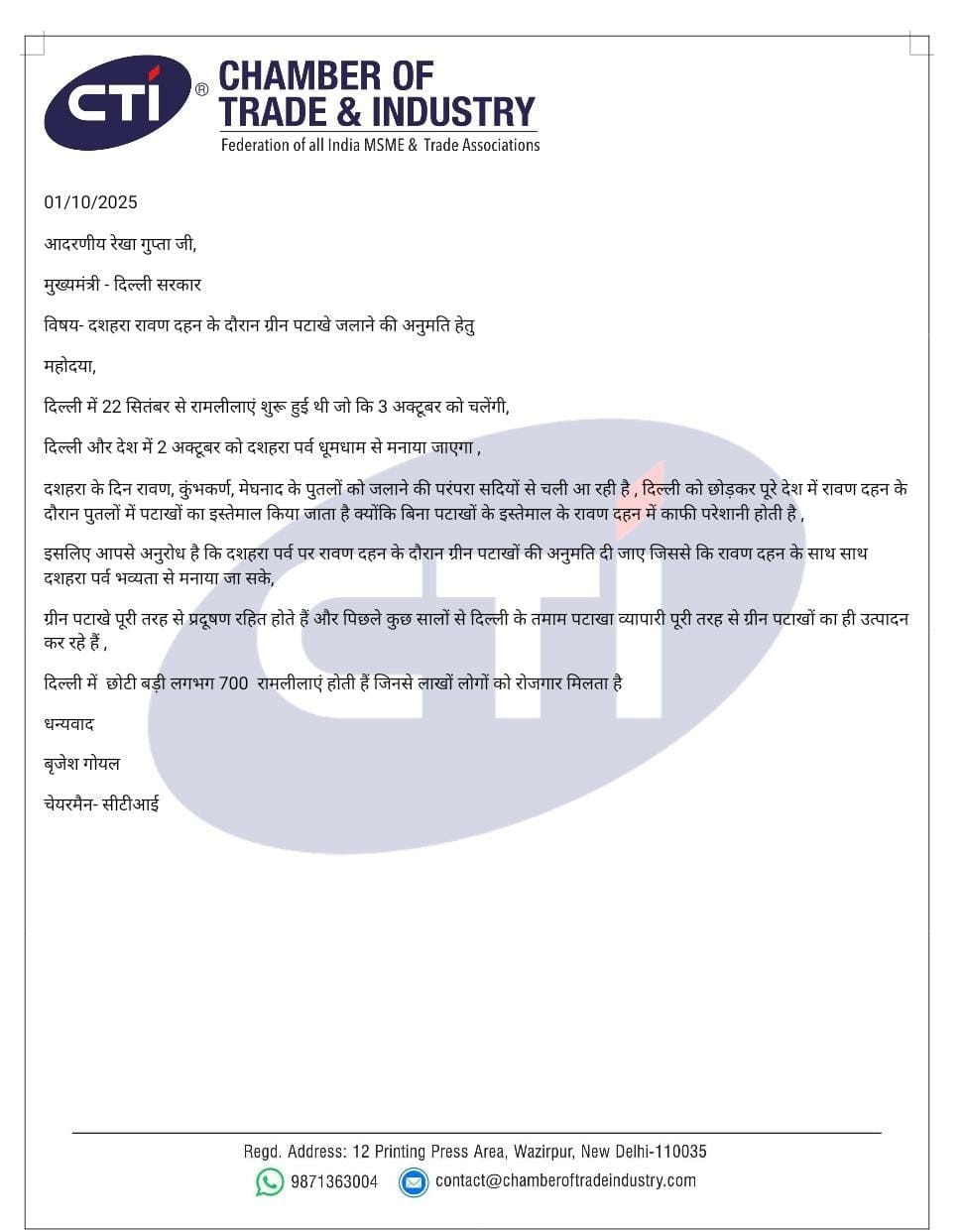 उधर, चैंबर ऑफ ट्रेड एंड इंडस्ट्री (CTI) के चेयरमैन बृजेश गोयल ने दिल्ली की मुख्यमंत्री रेखा गुप्ता को पत्र लिखकर दशहरे पर रावण दहन के दौरान ग्रीन पटाखों के इस्तेमाल की अनुमति मांगी है. गोयल ने कहा कि रावण, कुंभकर्ण और मेघनाद के पुतलों में पटाखों का इस्तेमाल दशकों पुरानी परंपरा रही है. दिल्ली को छोड़कर देशभर में रावण दहन के दौरान पटाखों का उपयोग किया जाता है, जबकि बिना पटाखों के रावण दहन अधूरा सा लगता है.