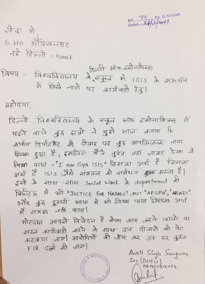 27 मई को अंकित सिंह सांगवान ने थाने में शिकायत देकर पुलिस से मुकदमा दर्ज करने की मांग की. इसके बाद हरकत में आई पुलिस ने मामले की जांच शुरू कर दी है. अंकित का दावा है कि दिल्ली विश्वविद्यालय के स्कूल ऑफ इकोनॉमिक्स में पढ़ने वाले छात्रों ने उनको बताया कि कॉमर्स डिपार्टमेंट की दीवार पर कुछ आपत्तिजनक नारा लिखा हुआ है. इस पर वह फौरन वहां गए, जहां उनको दीवार पर I SYM ISIS लिखा मिला.