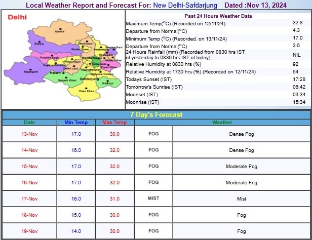 मौसम पूर्वानुमान की बात करें तो दिल्ली में आज (बुधवार) सुबह की तरह ही शाम के समय भी आसमान में स्मॉग या कोहरा छाया रह सकता है. अधिकतम तापमान 30 और न्यूनतम तापमान 17 डिग्री रहेगा. 14 से 16 नवंबर के बीच अधिकतम तापमान 32 डिग्री और न्यूनतम तापमान 16 से 17 डिग्री रह सकता है. इसके बाद हवाओं की वजह से दिन के तापमान में गिरावट दर्ज की जा सकती है.
