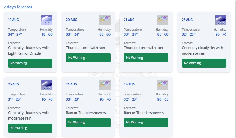 मौसम विभाग के अनुसार, सुबह 8.30 बजे सापेक्षिक आर्द्रता 97 प्रतिशत के आसपास रही और अधिकतम तापमान 35 डिग्री सेल्सियस के आसपास रहने की संभावना है. बता दें कि दिल्ली में पिछले एक हफ्ते ऐसी बारिश हुई कि जगह-जगह भारी जलभराव देखने को मिला. लोगों का आने-जाने में परेशानी का सामना करना पड़ा.