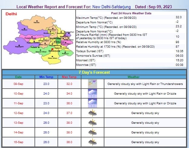Weather Today: राष्ट्रीय राजधानी नई दिल्ली में जी20 समिट के दौरान मौसम सुहावना हो गया है. हल्की बारिश ने ही उमस भरी गर्मी से राहत दी है. मौसम के करवट लेने से दिल्ली-एनसीआर के लोगों ने राहत की सांस ली है. बीती रात से ही बारिश का दौर जारी है. IMD के मुताबिक, दिल्ली में आज (रविवार), 10 सितंबर को भी कई जगहों पर हल्की से मध्यम बारिश होने की संभावना है. अक्षरधाम, नोएडा, फरीदाबाद, गुरुग्राम और दिल्ली के कई इलाकों में लगातार बूंदाबांदी देखने को मिल रही है.
