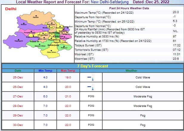 मौसम विभाग (IMD) के मुताबिक, दिल्ली में क्रिसमस के दिन आज (रविवार), 25 दिसंबर को न्यूनतम तापमान 3 डिग्री सेल्सियस तक पहुंच गया है जबकि अधिकतम तापमान 19 और 20 डिग्री सेल्सियस तक बना रहने का अनुमान है. दिल्ली में अगले 24 घंटे 4 डिग्री सेल्सियस तक न्यूनतम तापमान रहने का अनुमान है. साथ ही शीतलहर की चेतावनी भी है.