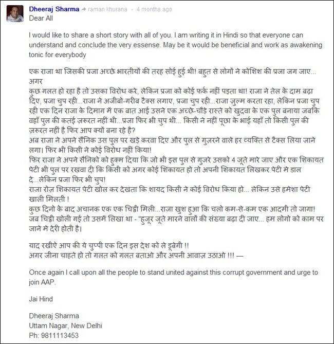 आम आदमी पार्टी ने दिल्ली विधानसभा चुनावों में अभूतपूर्व जीत दर्ज करते हुए यह साबित कर दिया है कि दिल्ली की जनता राजनीतिक परिवर्तन चाहती है. इस जीत के बाद कई लोगों ने AAP की वेबसाइट पर बधाई संदेश भेजे हैं. हजारों की तादाद में आए इन संदेशों में लोगों को जागरुक करने को लेकर एक कहानी भी भेजी गई है जो लोगों को जागरुक करने के लिए प्रेरित करती है और यह संदेश देती है कि अगर अब भी इस देश में कोई ऐसा व्यक्ति है जो सोया है तो जाग जाए. इसे आप भी पढ़ें...