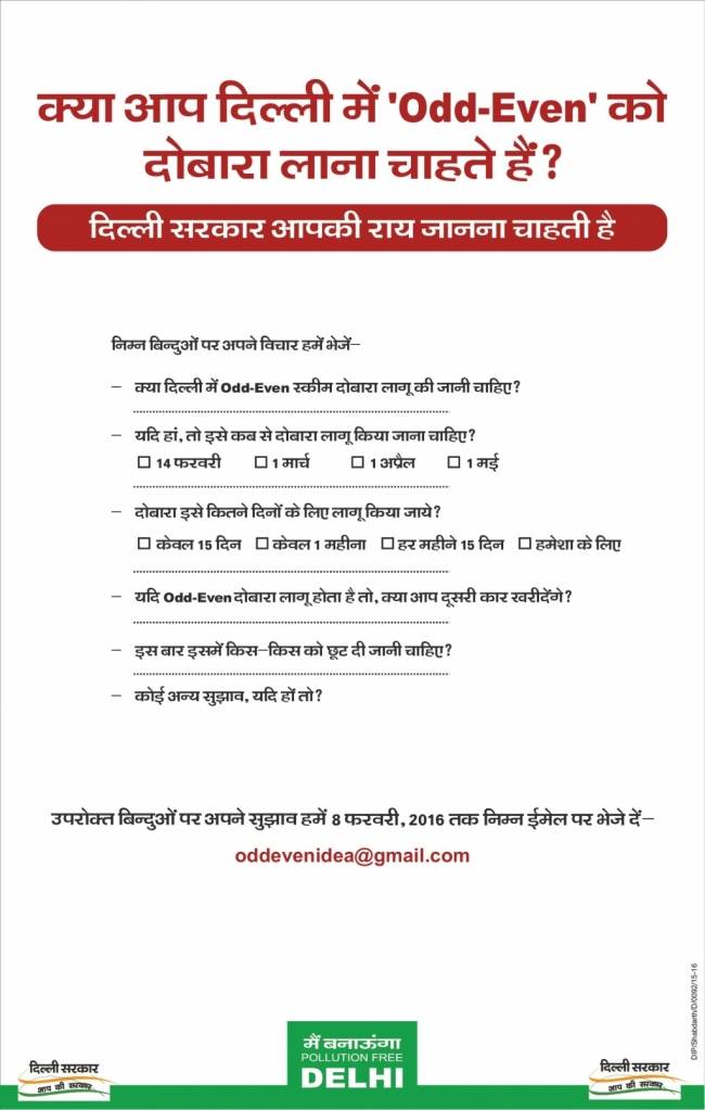 दिल्ली में ऑड-इवन फॉर्मूला दोबारा लागू करने को लेकर केजरीवाल सरकार ने अब जनता की राय मांगी है. सरकार ने इस संबंध में विज्ञापन जारी करके लोगों से छह सवाल किए हैं. इनके जवाब 8 फरवरी तक देने की अपील की गई है.