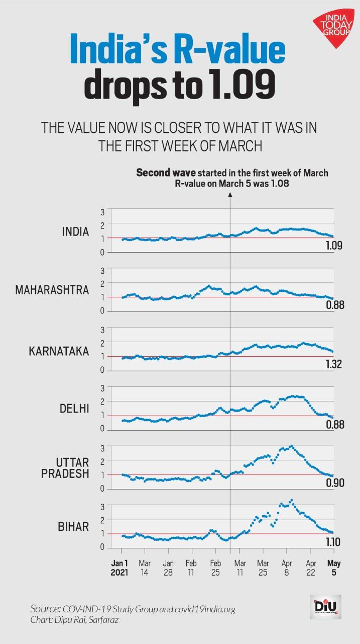 वहीं पांच प्रमुख राज्यों में आर-वैल्यू 1 से नीचे आ गई है, जिसमें उत्तर प्रदेश और महाराष्ट्र जैसे घनी आबादी वाले राज्य शामिल हैं. इसके अलावा बुरी तरह से प्रभावित दिल्ली में भी आर-वैल्यू 1 से नीचे आ गई है. यह एक राहत भरी खबर है.