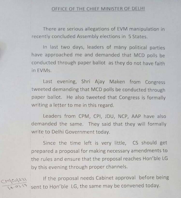 आम आदमी पार्टी के नेता संजय सिंह भी कह चुके हैं कि अगर उत्तर प्रदेश में नगर पालिका और नगर पंचायत के चुनाव बैलेट पेपर से करवाए जा सकते हैं तो दिल्ली में भी नगर निगम चुनाव बैलेट पेपर से करवाए जा सकते हैं. ईवीएम में गड़बडियों से आशंकित केजरीवाल की दिल्ली सरकार नगर चुनावों में ईवीएम का रिस्क नहीं लेना चाहती और बैलेट पेपर से चुनाव कराना चाहती है. इसी वजह से अरविंद केजरीवाल ने मुख्य सचिव को पत्र लिखकर बैलेट पेपर से चुनाव कराने की मांग की है.