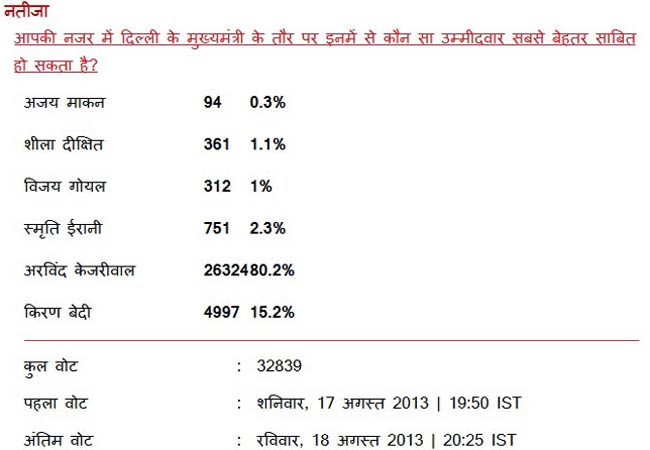 दूसरे नंबर पर 15 फीसदी वोट के साथ पूर्व आईपीएस अधिकारी किरण बेदी थीं, जिन्हें 4997 लोगों के वोट मिले. बीजेपी की ओर से स्मृति ईरानी को 2.3 फीसदी, जबकि वर्तमान मुख्यमंत्री शीला दीक्षित को 1.1 फीसदी वोट मिले. शनिवार को यह खबर आई थी कि बीजेपी दिल्ली में CM के लिए किरण खेर, किरण बेदी और स्मृति ईरानी के नामों पर विचार कर रही है . यह ऑनलाइन पोल इसी खबर के बाद किया गया.