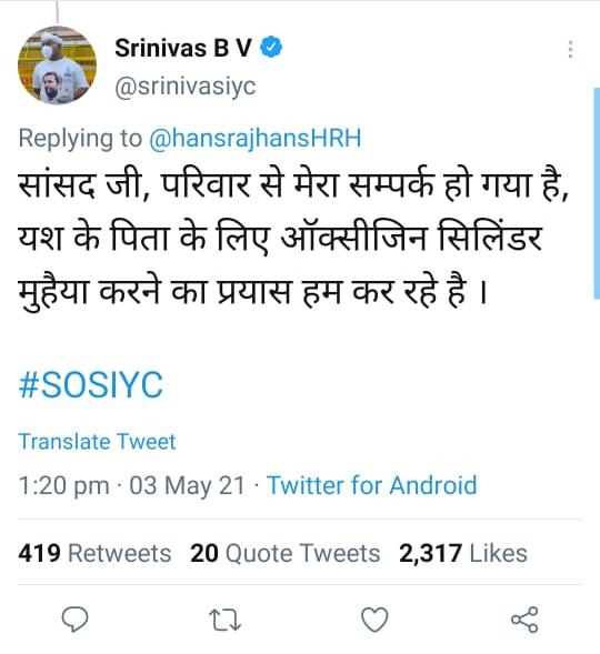 बीजेपी सांसद हंसराज हंस ने अपने ट्वीट में कहा कि दिल्ली के अशोक विहार के ए-62 में रहने वाले यश सिंधवानी को तत्काल ऑक्सीजन की जरूरत है. इस मैसेज के साथ उन्होंने #SoS #SoSDelhi टैग भी किया. उनके इस ट्ववीट पर यूथ कांग्रेस के अध्यक्ष श्रीनिवास बीवी ने तुरंत जवाब दिया.