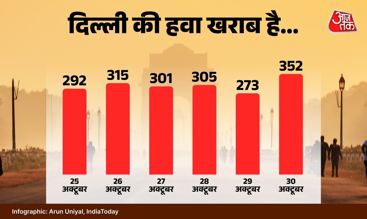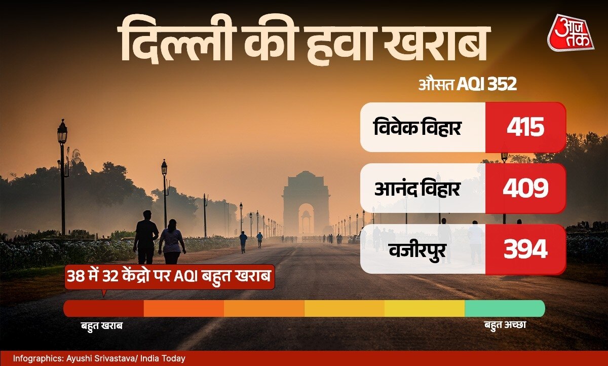 केंद्रीय प्रदूषण नियंत्रण बोर्ड (CPCB) के मुताबिक, आज (गुरुवार) 30 अक्टूबर को आनंद विहार इलाके में AQI 409 पहुंच गया जो 'गंभीर' श्रेणी में आता है. वहीं, लोधी रोड इलाके में भी AQI 325 दर्ज किया गया है, जो 'बेहद खराब' श्रेणी में है. इसके अलावा इंडिया गेट इलाके में भी हवा की गुणवत्ता 319 AQI के साथ 'बेहद खराब' श्रेणी में रिकॉर्ड की गई है.