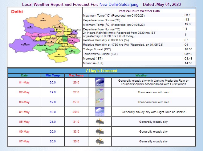राजधानी दिल्ली में मई की शुरुआत जोरदार बारिश से हुई और तपती गर्मी के मौसम में ठंड का एहसास होने लगा. भारी बारिश ने तापमान को 26.1 डिग्री सेल्सियस पहुंचा दिया, जो इस समय के औसत तापमान से 13 डिग्री कम है. मौसम विभाग के मुताबिक, आने वाले दिनों में भी मौसम सुहाना बना रहेगा.