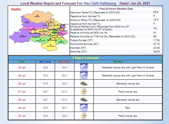 मौसम विभाग (IMD) के पूर्वानुमान के मुताबिक, आज (मंगलवार) भी दिल्ली के कई इलाकों में हल्की बारिश हो सकती है. इसके अलावा 25 जनवरी को भी हल्की बारिश और बूंदाबांदी का ये सिलसिला देखने को मिल सकता है. हालांकि, 26 जनवरी को बारिश के आसार नहीं हैं, जबकि आसमान में घने बादल छाए रहने का अनुमान है. वहीं, 28 जनवरी को एक बार फिर घने बादल डेरा डालेंगे और 29 एवं 30 जनवरी को फिर बारिश एवं बूंदाबांदी होने की संभावना है. ऐसे में एक हफ्ते में 4 दिन बारिश हो सकती है. वहीं, नोएडा, गाजियाबाद, कानपुर और लखनऊ में भी हल्की बारिश होने का अनुमान जताया गया है.