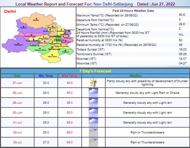 भारत मौसम विज्ञान विभाग (आईएमडी) के पूर्वानुमान के मुताबिक, 28 जून से दिल्ली में न्यूनतम तापमान 26 डिग्री सेल्सियस पहुंच सकता है. वहीं, 29 जून से दिल्ली का अधिकतम तापमान 40 डिग्री सेल्सियस से नीचे आने की संभावना है. पूरे सप्ताह दिल्ली में आंशिक तौर पर बादल छाए रहने के साथ हल्की बारिश का सिलसिला देखने को मिलेगा.