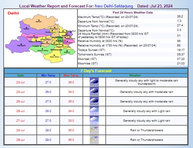 खासतौर पर दिल्ली की बात करें तो मौसम विभाग ने यहां दो दिन के लिए येलो अलर्ट जारी किया है. आईएमडी ने बुधवार को मध्यम बारिश की भविष्यवाणी की है और अधिकतम व न्यूनतम तापमान 34 और 26 डिग्री सेल्सियस के आस-पास रहने की संभावना है. बता दें कि कल (23 जुलाई) शहर का अधिकतम तापमान 36.2 डिग्री सेल्सियस दर्ज किया गया, जो सामान्य से 1.3 डिग्री अधिक था.