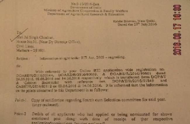 आरटीआई के अन्तर्गत पीएमओ से मांगी गई जानकारी के बाद ये खुलासा सामने आया है कि आईसीएआर के महानिदेशक पद के लिए जो अर्हताएं विज्ञापन में तय की गईं, उसकी खुली अनदेखी कर ऐसे व्यक्ति की महानिदेशक और सचिव पद पर नियुक्ति को हरी झंडी दे दी गई जिसने विज्ञापित पद के लिए न तो आवेदन ही किया और ना ही उनका किसी जानी मानी शख्सियत ने तय समय-सीमा के भीतर नामांकन ही किया.