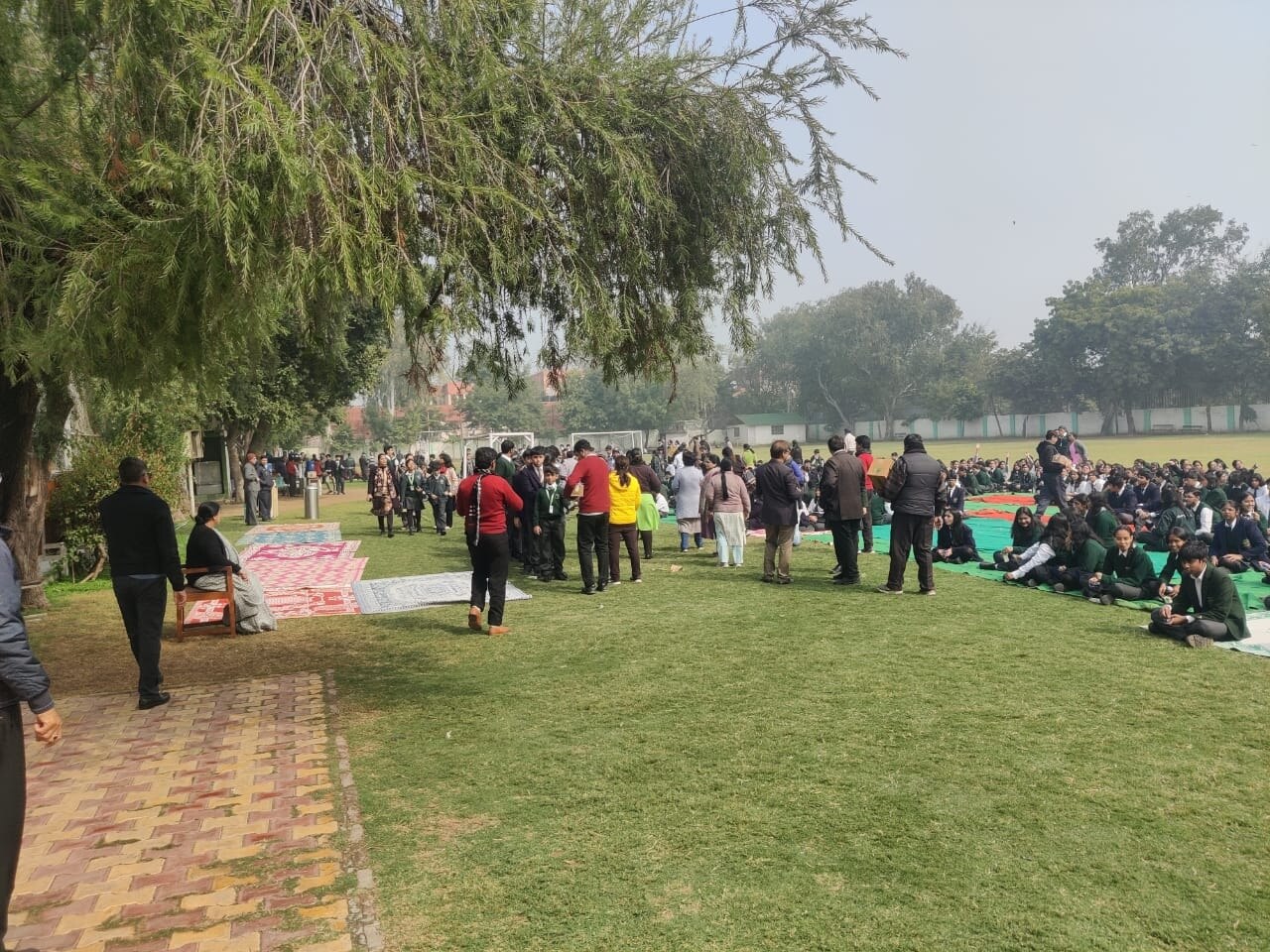 स्कूल में ब्लास्ट की सूचना के बाद ग्राउंड में बैठे बच्चे.