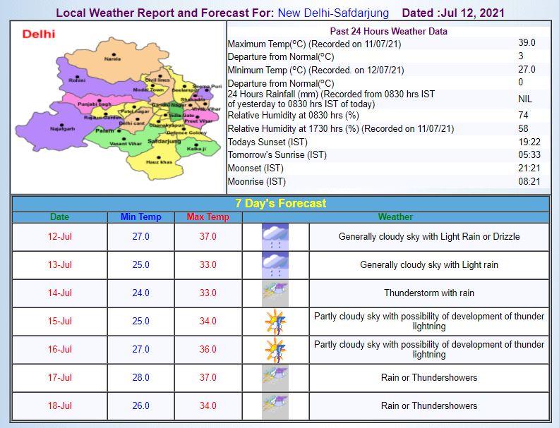 > 17 जुलाई- दिल्ली में तेज हवा के चलने के साथ बारिश की संभावना है. तापमान 28 से 37 डिग्री सेल्सियस के बीच रहने का अनुमान.